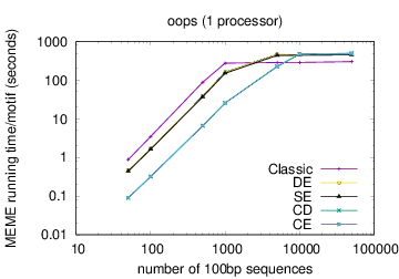MEME's running time depends on the type of model you have chosen: oops < zoops < anr. Running time also depends on the objective function you have chosen: ce,cd < de, se < classic « nc, for small datasets; the order reverses (except for nc) for very large datasets. Running time also is affected by the options -csites, -searchsize, -hsfrac, or -cefrac. Running time is shorter with smaller alphabets (e.g., DNA) compared to with larger alphabets (e.g., Protein). Running time increases with the number of motif widths that MEME considers (see the options -w, -maxw, -minw, and -allw). The table below gives more details on the relationship between sequence dataset size and MEME's running time with large datasets.